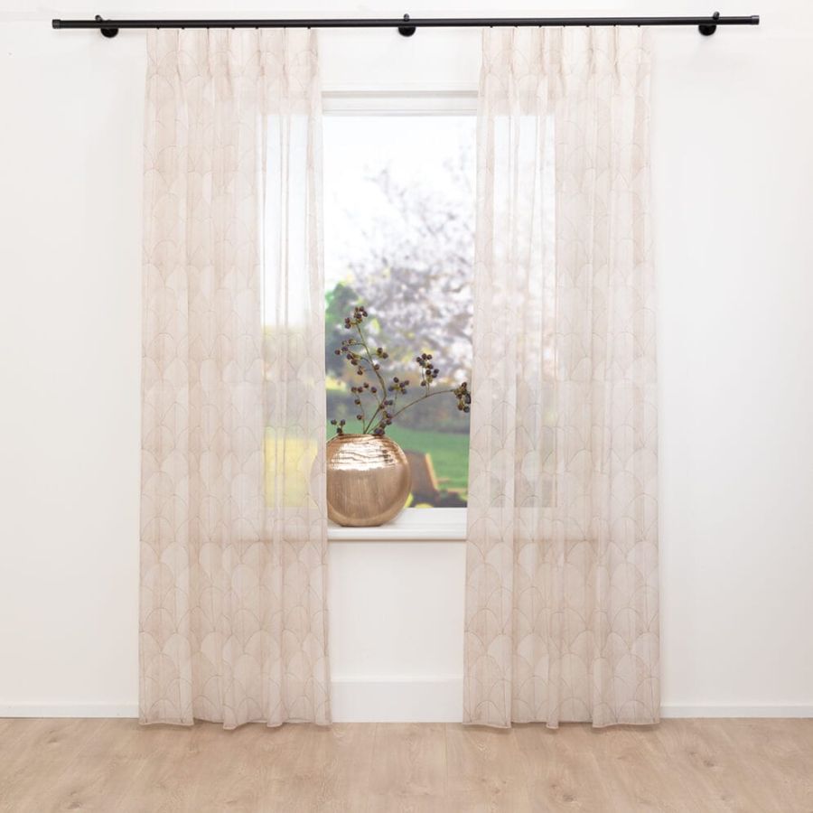 Voor een interieur met een gouden randje moet u Arcade kiezen. Deze chique transparant springt in het oog door de bogen met gouden omlijning. De schaduweffecten zorgen voor diepte in de print, waardoor een reliëf lijkt te ontstaan. Door het verzwaringskoord hangt Arcade altijd goed en door de vlamvertragende eigenschappen creëer je een veilige omgeving. Ga voor deze duurzame gordijnen gemaakt van meer dan de helft gerecycled polyester en bedrukt door onze waterbesparende printer.