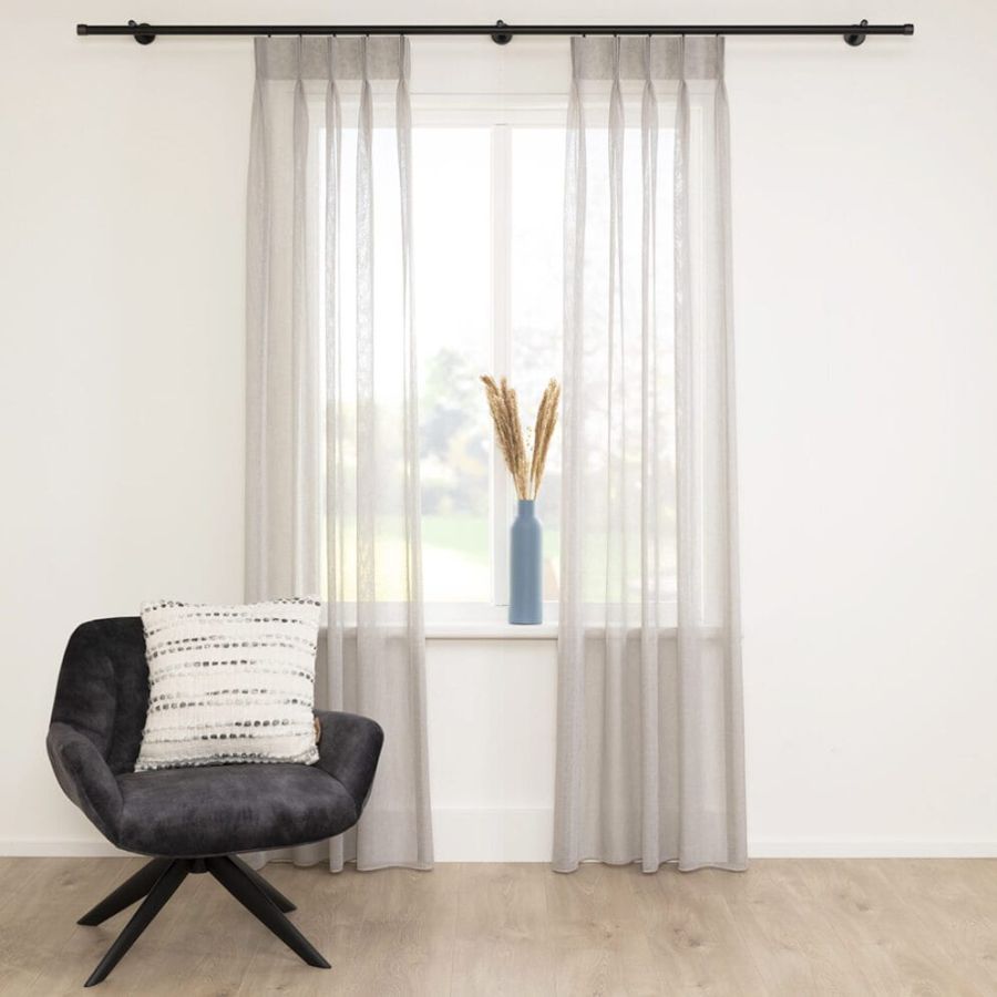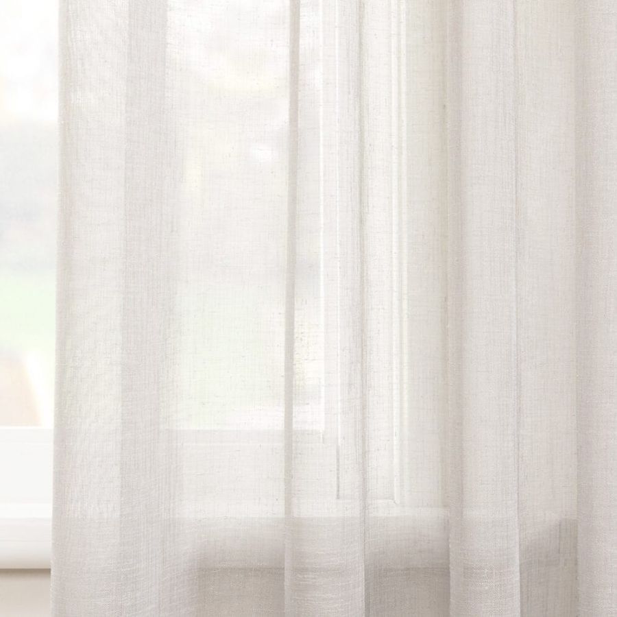 Open geweven vitrage met een natuurlijk ogende linnenlook. De stof is kamerhoog zodat in de confectie geen naden zichtbaar zullen zijn. Aan de onderzijde van de stof is een verzwaringskoord gemaakt, zodat deze prachtig valt en er geen zoom in hoeft.