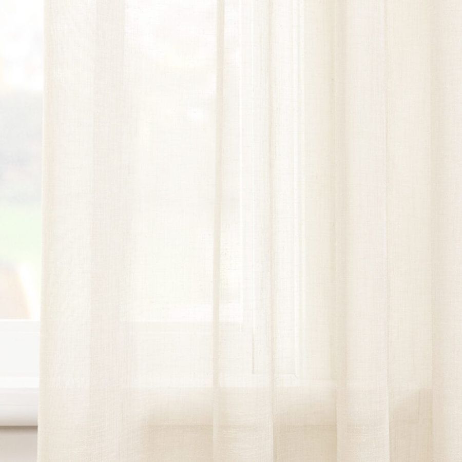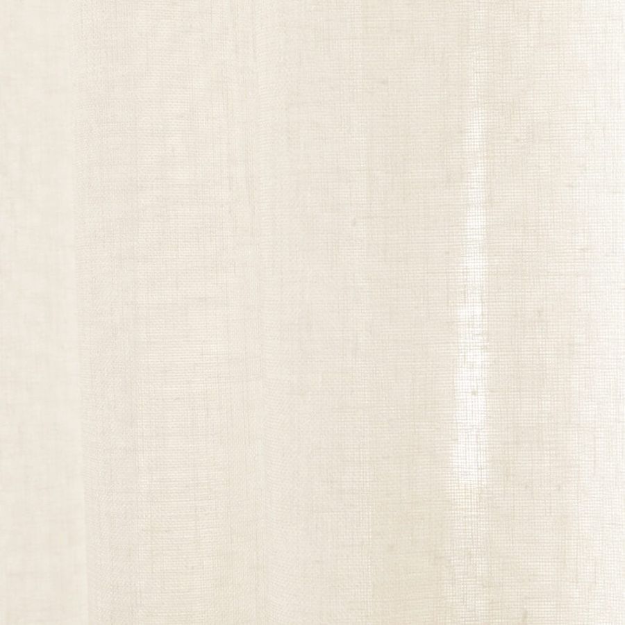 Open geweven vitrage met een natuurlijk ogende linnenlook. De stof is kamerhoog zodat in de confectie geen naden zichtbaar zullen zijn. Aan de onderzijde van de stof is een verzwaringskoord gemaakt, zodat deze prachtig valt en er geen zoom in hoeft.
