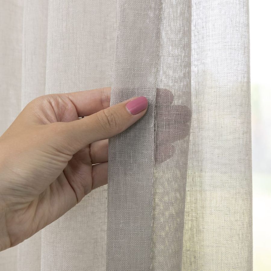 Open geweven vitrage met een natuurlijk ogende linnenlook. De stof is kamerhoog zodat in de confectie geen naden zichtbaar zullen zijn. Aan de onderzijde van de stof is een verzwaringskoord gemaakt, zodat deze prachtig valt en er geen zoom in hoeft.