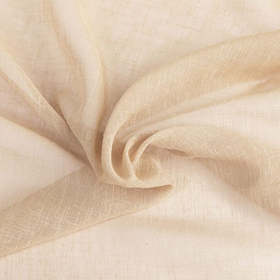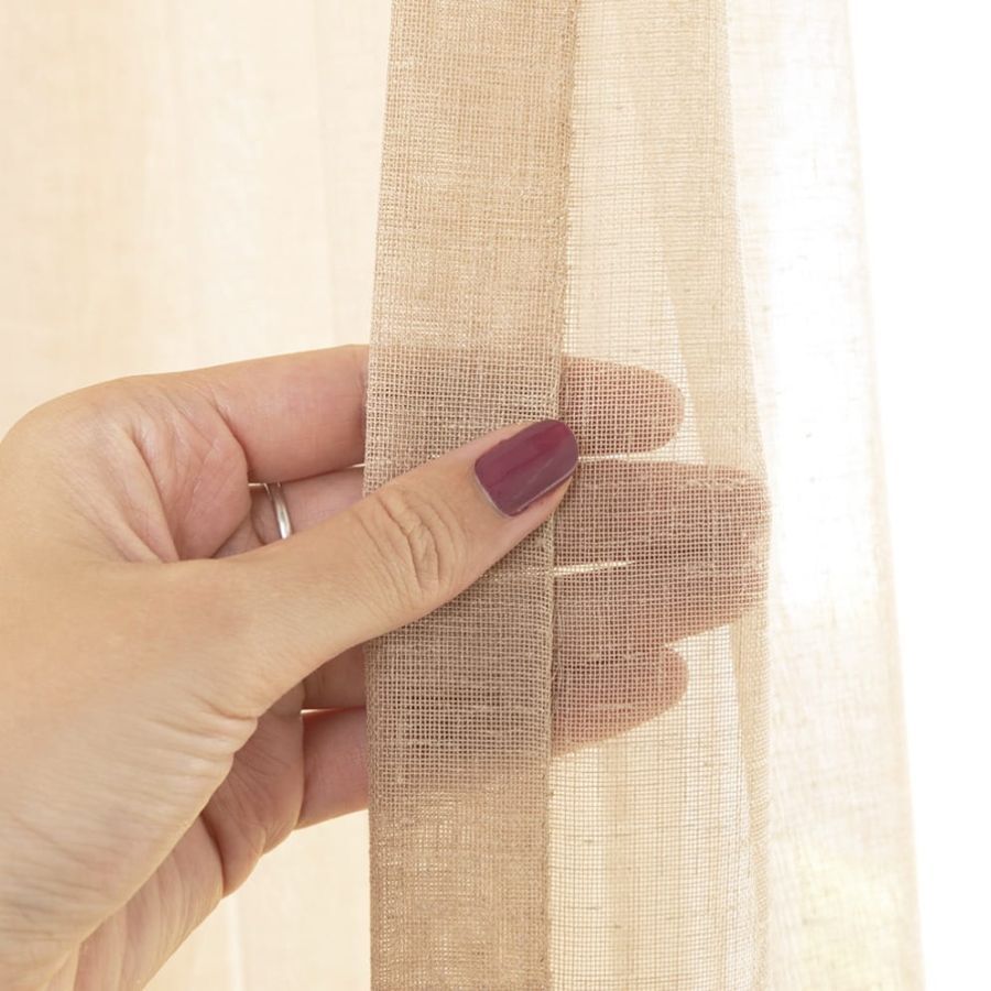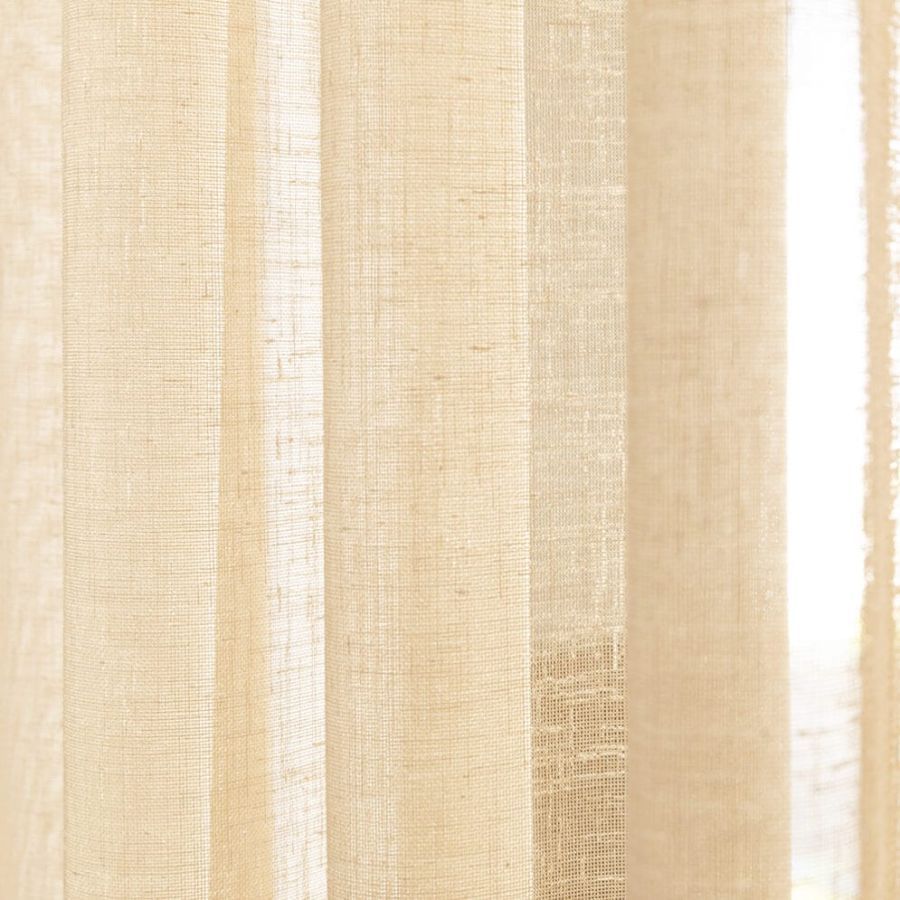 Open geweven vitrage met een natuurlijk ogende linnenlook. De stof is kamerhoog zodat in de confectie geen naden zichtbaar zullen zijn. Aan de onderzijde van de stof is een verzwaringskoord gemaakt, zodat deze prachtig valt en er geen zoom in hoeft.